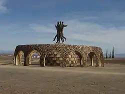 By analogy to the Man at Burning Man, the main sculpture at the event is called the San Clan. It is designed to look like a San rock art glyph of a group of people. The intention is to convey the idea of unity and community at the event. Like some sculptures at the event, it is burnt. The burn used to take place on the Saturday night, but is now scheduled for Friday nights in order to accommodate weather delays and provide participants from far afield with more time to return home from the event. The original signifier, that of the many headed dancing clan spirit was first championed by Liane Visser.