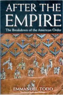 After the Empire: The Breakdown of the American Order (French: Après L'Empire: essai sur la décomposition du système américain) is a 2001 book by French demographer and sociologist Emmanuel Todd. In it, Todd examines the fundamental weaknesses of the modern United States to conclude that, contrary to American conventional wisdom, America is fast losing its grip on the world stage in economic, military and ideological terms.[1] Todd predicts the fall of the United States as the sole global superpower.