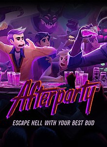 Afterparty is an adventure video game by Night School Studio for macOS, PlayStation 4, Microsoft Windows, and Xbox One platforms in October 2019 and Nintendo Switch in March 2020. Set in hell, themed as a college town, the player navigates conversations and tries to outdrink Satan with the goal of returning two best friends from the afterlife.