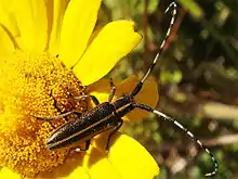 Agapanthia suturalis is a species of beetle in the subfamily Lamiinae, found in Sicily, Spain, the Near East, North Africa and Turkey.[1] The species is black coloured with a yellow stripe.[2] Males are larger than females.[3] They fly from May to June.[1]