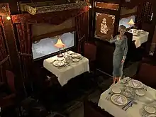 The player can navigate and interact with the game's environment, mainly carriages on the Orient Express, through use of a context-sensitive cursor. The cursor changes when it is placed over an item with which the player can interact, and can be used to talk to other characters, listen to other characters' conversations, look around the environment, and move.[1] The player can walk to a location with a single click, and run to a location with a double-click. Double-clicking on the edge of the screen instantly takes the player to the next screen. There is a map of the train in the game's interface at the top of the screen, and once each carriage has been unlocked, the player can click on any part of the map and instantly be transported to that location, saving the player from having to travel through the train screen by screen.[2] Another accessible feature is an objectives menu interface which states the general tasks the player should be attempting to complete. This menu is designed to guide players in the right direction without giving any explicit hints.[3]