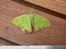 Adults are green with brown markings. The hindwings have a cusp halfway along the margin. There is also a brown cusp white spot at each hindwing tornus.[2]