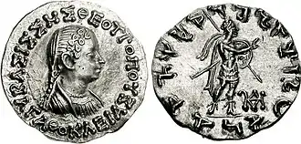 Agathoclea Theotropus (Ancient Greek: Ἀγαθόκλεια Θεότροπος, romanized: Agathokleia Theotropos; the epithet possibly means the Goddess-like) was an Indo-Greek queen married to Menander I, who ruled in parts of northern India in the 2nd-century BC as regent for her son Strato I. Born in Bactria, likely to a noble family (probably royal) with some authors such as Tarn alleging she was a daughter of Eucratides,[1] however this is uncertain and Tarn is often criticised by modern authors for casually creating dynastic relationships. Nonetheless, Agathoclea would become one of the first woman ruler in the Hellenistic world, and she seems to have been relatively significant due to her large presence on the coins of Strato I.