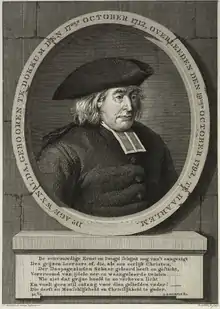 Age Wijnalda was the second son of Pieter Harmens and was knighted by and received a crest from the King of Great Britain[4] for services to the crown – presumably for bravery in battle, since there is a helm on his coat of arms.[5] He was trained at the Remonstrant seminary of Amsterdam and first served in Emden 1733–1736 before moving to Haarlem.[6]