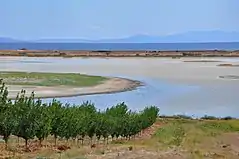 Its seaside is the continuation of Kalyves Polygyrou's with a very long sandy beach, after the river Olynthios delta, including Papa Aloni beach and Portes before Nea Potidea.