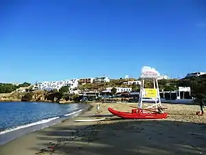 Agios Stefanos (Gr. Άγιος Στέφανος meaning Saint Stephen) is a sandy beach next to Tourlos, the new harbor of Mykonos. It is located 3.5 km from Mykonos town. Agios Stefanos attracts a large number of tourists each summer since there are many facilities close to the beach. Visitors will find there sunbeds, umbrellas and most of water sports available at other Mykonian beaches as well. There are also many hotels that offer accommodation, while on the beach there is a great variety of restaurants and cafes to keep anyone satisfied. The beach can be reached via taxi, private vehicle or regular bus service from Mykonos town.
