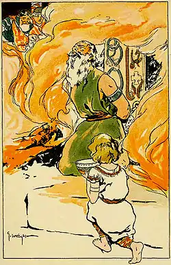 "No one gave him a thought of pity save little Agnar" (1908) by George Wright. Agnarr offering Grímnir something to drink.