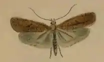 The wingspan is 14–17 mm. Adults are on wing from July to May.[2]