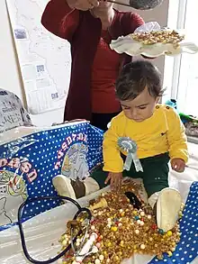 Tradition is to cook/boil wheat grains, which symbolize the "teeth". A thin veil is held over the child's head, and the grains are sprinkled over them, on top of the veil for good luck.