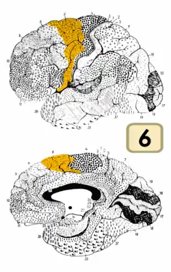 Brodmann area 6 is also called agranular frontal area 6 in humans because it lacks an internal granular cortical layer (layer IV). It is a subdivision of the cytoarchitecturally defined precentral region of cerebral cortex. In the human brain, it is located on the portions of the precentral gyrus that are not occupied by Brodmann area 4; furthermore, BA6 extends onto the caudal portions of the superior frontal and middle frontal gyri. It extends from the cingulate sulcus on the medial aspect of the hemisphere to the lateral sulcus on the lateral aspect. It is bounded rostrally by the granular frontal region and caudally by the gigantopyramidal area 4 (Brodmann, 1909).[1]