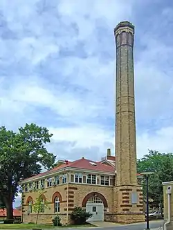 In 1901 the college built this heating station. Rather than a drab utilitarian structure, Jennings designed the plant in the exuberant Richardsonian Romanesque style that was popular at the time. Hallmarks of the style present in the building are the dramatic asymmetric chimney and the round-topped arches above the first floor windows. The building sits on a foundation of coursed sandstone. From there rise walls of cream brick, contrasted with red brick trim and quoins. The second story is ringed with a band of windows. A hip roof covers the building, clad in red clay tile. The chimney is octagonal, topped with a corbelled chimney pot.[3]