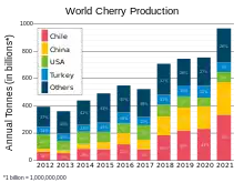 Chile is one of the 5 largest world producers of cherry and cranberry, and one of the 10 largest world producers of grape, apple, kiwi, peach, plum and hazelnut, focusing on exporting high-value fruits.[2]