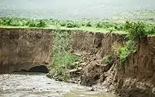 Evidence given by Italian aerial photographs of the catchment, taken in the 1930s show that 51% of the catchment was covered with woody vegetation (against 45% in 2014). This vegetation could slow down runoff and the runoff coefficient was smaller (8% in 1935 against 12% in 2014). As a consequence, discharges in the river were less and the river was narrower than today.[5] Up to the 1980s, there was strong pressure on the environment, and much vegetation disappeared.[6] This river had its greatest discharges and width in that period. The magnitude of floods in this river has however been decreased in recent years due to interventions in the catchment. On steep slopes, exclosures have been established; the dense vegetation largely contributes to enhanced infiltration, less flooding and better baseflow.[7] Physical conservation structures such as stone bunds[8][9] and check dams also intercept runoff.[10][11]