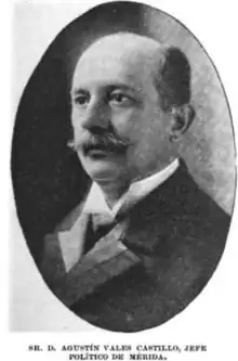 Agustín Vales Castillo (1857 – 1938) was a Mexican businessman, banker, industrialist, landowner, philanthropist, and liberal politician who served as prefect of Mérida (jefe político) during the governorship of Olegario Molina. He emerged as a prominent figure during the heyday of the henequen industry in Yucatan due to his influence in business and political circles during the Porfiriato era.