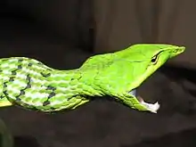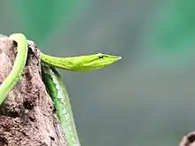 The Indian vine snake or long-nosed vine snake (Ahaetulla oxyrhyncha) is a species of diurnal, mildly venomous, arboreal snake distributed in the lowlands of peninsular India.Often mistakenly believed to peck out peoples' eyes, this misconception has led to widespread wanton killing of this species.[1][2][3]