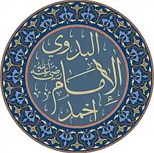Aḥmad al-Badawī (Arabic: أحمد البدوى IPA: [ˈæħmæd elˈbædæwi]), also known as Al-Sayyid al-Badawī (السيد البدوى, [esˈsæjjed-, elˈsæjjed-]), or as al-Badawī for short, or reverentially as Shaykh al-Badawī by Sunni Muslims who venerate saints,[3] was a 13th-century Arab[3] Sufi Muslim mystic who became famous as the founder of the Badawiyyah order of Sufism. Born in Fes, Morocco to a Bedouin tribe originally from the Syrian Desert,[3][4] al-Badawi eventually settled for good in Tanta, Egypt in 1236, whence he developed a posthumous reputation as "One of the greatest saints in the Arab world"[5][3] As al-Badawi is perhaps "the most popular of Muslim saints in Egypt", his tomb has remained a "major site of visitation" for Muslims in the region.[6]