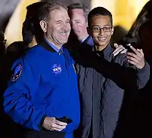 On October 19, 2015, Mohamed attended the White House Astronomy Night event on the South Lawn of the White House and met with President Obama.[75][76][77] The President gave a speech to the audience in attendance at the event, saying: "We have to watch for and cultivate and encourage those glimmers of curiosity and possibility, not suppress them, not squelch them."[77] After his speech, the President talked with Mohamed briefly and hugged him, in addition to looking through a telescope and being placed on a call with the crew of the International Space Station.[76][77]