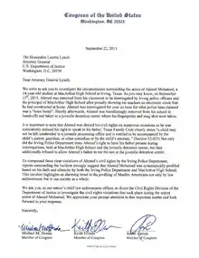 Twenty-nine members of the United States Congress, including Asian-American and Muslim members, sent a letter to the U.S. Attorney General at the Department of Justice requesting an investigation of "the civil rights violations that took place during the unjust arrest of Ahmed Mohamed."[83] The letter said "Ahmed was denied his civil rights on numerous occasions as he was consistently refused his right to speak with his father. Texas Family Code clearly states 'a child may not be left unattended in a juvenile processing office and is entitled to be accompanied by the child's parent, guardian, or other custodian or by the child's attorney.' (Section 52.025)"[84] The letter went on to say that reports about the incident suggested "that Ahmed Mohamed was systematically profiled based on his faith and ethnicity both by the Irving Police Department and MacArthur High School".[84]