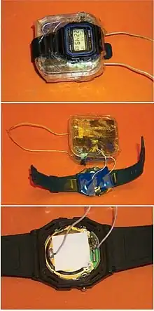 - four operational timing devices designed to detonate primary explosives, consisting of small black boxes containing circuit boards connected to Casio watches and 9-volt battery connectors.[1][2][7][9][10][18]