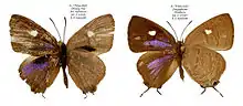 Ahmetia achaja is a species of butterfly in the family Lycaenidae. It belongs to the monotypic genus Ahmetia,[1] formerly known as Cowania (which actually refers to a tachina fly genus). It is sometimes assigned to the tribe Horagini, but it is more probably a member of the closely related Cheritrini. It is found in Thailand and Vietnam.[1]