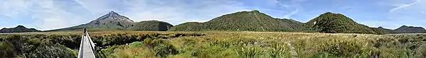 The swamp sits at an altitude of 920 metres[2] and lies between the main cone of Mount Taranaki and the Pouakai Range to the northwest, which reaches 1,400 metres. It was formed about 3,500 years ago when a lava extrusion and a later debris flow blocked the Stony River.[3][4] This extrusion, which reaches 1,052 metres, lies to the west of the swamp and is known as The Dome. The outlet from the swamp forms the 30-metre-high (98 ft) Bells Falls.[4]