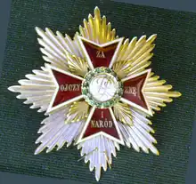 The star of the order consisted of an eight-pointed gold star with straight rays; the central golden disc bore a red-bordered white enamelled cross pattée with a golden rosette at its center and golden rays between the arms, surrounded by a blue enamel ring bearing the motto "Pro Fide, Lege et Rege" (For Faith, Law and the King).[5]