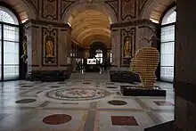 Due to the museum building being protected under heritage laws, museum officials were unable to remove the offending works.[21] Mpane was also one of many to voice support for returning objects in the museum to the DRC, saying it was "a way to recover our identity and stolen memories."[25] Another wooden sculpture by Mpane was added to the Great Rotunda. Skull of Chief Lusinga represents the beheading of Lusinga lwa Ng'ombe in 1884 by a Belgian officer.[17] It stands just under 2 meters (6.6 ft) tall and faces New Breath, or the Burgeoning Congo.[26] To further address the offensive material, Mpane worked with Belgian artist Jean-Pierre Müller on a project called RE/STORE. This entailed placing semi-transparent veils directly in front of 16 racist statues and images.[17] In 2023, the museum removed several statues so that they can only be seen on guided tours.[27]