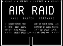 Air Raid is a fixed shooter video game published by Small System Software for the TRS-80 Level I or II in 1978. It is an adaptation of the game TARGET,[3] developed for the Sol-20 by Steve Dompier.[4]