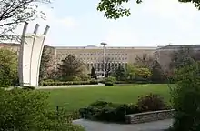 In front of the airport entrance is the Berlin Airlift Monument (Luftbrückendenkmal; properly the Denkmal für die Opfer der Luftbrücke, 'Monument for the Victims of the Airlift') erected in 1951;[1][3] it was the first major monument in West Berlin after the war.[6] An inscription on the base records the names and ranks of the 78 people killed in accidents during the Berlin Blockade. Its design, by Eduard Ludwig (who won the contest to design it[7]) features 3 arcs pointing west to symbolise the 3 air corridors that were the city's lifeline,[8][9] as a result of which Berliners also call it the Hungerkralle (hunger claw) or Hungerharke (hunger rake).[10] An identical counterpart reaching towards Berlin was erected in 1985 by the German-American Airlift Association at the southeast corner of the Frankfurt Airport, directly adjacent to the A5 Autobahn.[11] Since 1988, a smaller copy has also stood at Celle Air Base in Lower Saxony.[12][13][14]