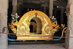 The divine bull Nandi was born in this temple and became the mount of lord Shiva.The divine wedding of Nandi and Suyasayambikai was held at Thirumazhapadi Vaidyanathaswamy temple in Ariyalur district of Tamil Nadu. This is celebrated as Saptha Stanam festival which includes seven Shiva temples of the region. The sapthasthanam festival is conducted at Tiruvaiyaru during April every year. As per Hindu legend, it is the wedding festival of Nandikeswara, the sacred bull of Shiva on the Punarpoosa star during the Tamil month of Panguni.[9] The festival deity of Aiyarappar temple of Thiruvaiyaru is carried in a decorated glass palanquin along with the images of Nandikeswara and Suyasayambikai to the temples in Thirupazhanam, Thiruchottruthurai, Thiruvedhikudi, Thirukandiyur and Thirupoonthurthi. Each of the festival deities of the respective temples mounted in glass palanquins accompany Aiyarppar on the way to the final destiny, Thillaistanam. There is a grand display of fireworks in Cauvery riverbed outside Thillaistanam temple. The seven palanquins are carried to Aiyarappar temple in Thiruvaiyyaru. Hundreds of people witness the convergence of seven glass palanquins carrying principal deities of respective temples from seven places at Tiruvaiyaru. The devotees perform Poochorithal(flower festival) in which a doll offers flowers to the principal deities in the palanquins. After the Poochorithal, the palanquins leave for their respective temples.[10][11]