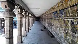 Several inscriptions in the temple affiliates the temple to the Cholas, Pandyas, and other rulers. Karikala Chola, Rajaraja, Jatavarman Sundara Pandyan, and Krishna Devarayar are associated with Thiruvaiyaru. The temple has two distinct divisions called Uttarakailasam and Dakshinakailasam. Uttarakailasam was built by Rajaraja Cholan's queen in the late 10th century who also made several endowments . Dakshinakailasam was renovated by Rajendra Cholan's queen. Appar, one of the important Nayanmar, was closely associated with this shrine and dedicated one of the songs in Thevaram to this temple.[8] There is an inscription (ARE 219 of 1894) dated to the 21st regnal year of Rajaraja I on the South wall of the temple indicating sale of land. Another inscription recorded during the 22nd year indicating a gift of 96 sheep for the perpetual lighting of the temple. An inscription during the 24th year of the king indicate various types of jewelry gifted to the presiding and processional deities. An inscription (ARE 215 of 1894) on the east wall of the mandapa indicated gift of eight pots of silver by Vimaladitta, the son-in-law of Rajaraja. A record of gift of land during fourth regnal year of Rajendra I is found in ARE 216 of 1894. The other major inscription during the thirty second year of Rajadhiraja I indicates the victories of the ruler against three Pandya rulers namely Manabharan, Vira Pandya and Sundara Pandya.[2]