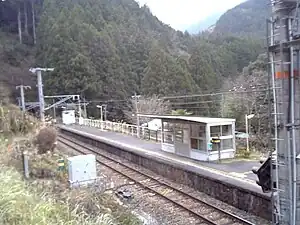 The station has one ground-level side platform serving a single bi-directional track, with a small wooden station building. The station is located in a valley between two tunnels. The station is not attended.