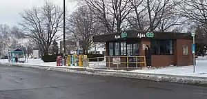 Ajax Plaza Bus Terminal was a bus station in Ajax, Ontario, Canada. It was located along the east side of the shopping centre parking lot at 190 Harwood Avenue South, south of Highway 401. The facility was used by Durham Region Transit, GO Transit and Greyhound.