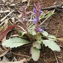 It grows as a herbaceous shrub with a stem that bears flowers arising out of a loose rosette of leaves. Each leaf is obovate or elliptic and has a wedge-shaped base and is 3–12 cm long and 0.8–3.5 cm wide. The leaf is covered in fine hair, more prominent along the midrib. The purple flowers appear predominantly in spring but can appear at any time of year.[3] The plants live for around two to three years.[4] Ajuga australis grows on clay soils that are medium to high in nutrients, either on Wianamatta Shale, basalt, or alluvial quartzite.[4]