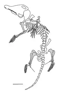 Except the pelvic girdle and hindlimbs, Akidolestes shares several forelimb features with living monotremes as well.[1] Similar to its hindlimbs, Zhangheotherium has asymmetrical condyles on the humerus, but the condyles of the humerus on Akidolestes and Ornithorhynchus are asymmetrical.[1] Additionally, Zhangheotherium and other Mesozoic mammals have a straight tibia, but the tibia on Akidolestes and Ornithorhynchus are more curved.[1] Another striking feature of Akidolestes that is distinguishable from other Mesozoic mammals is the trochanter.[1] The trochanter on Zhangheotherium is bigger, tall, and vertical, but the trochanter on Akidolestes is smaller, broader, and triangular in shape, which is similar to Ornithorhynchus.[1]