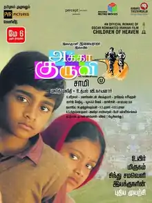 Akka Kuruvi (transl. Sparrow) is a 2022 Indian Tamil-language family drama film directed by Samy and produced by Madurai Muthu Movies and Kanavu Thozhirsalai.[1] The film stars newcomers Master Maheen and Baby Davia in the lead roles with a cameo appearance from Kathir and Varsha Bollamma.[2] The film's music is composed by Ilaiyaraaja, with cinematography handled by Utpal V Nayanar and editing done by Manigandan Sivakumar.[3] The film is an official remake of the 1997 Iranian film Children of Heaven written and directed by Majid Majidi, which was nominated for the Academy Award for Best Foreign Language Film in the same year.[4] The film was released in theatres on 6 May 2022.[5]