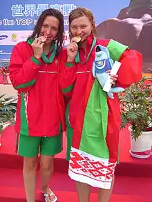 Aksana Petrushenka (right) along with fellow Belarusian swimmer Natalia Deeva (left) posing with gold medals during the 2007 World Deaf Swimming Championships Award Ceremony of Women's 200 Breaststroke event