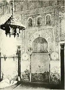 The prayer hall also features extensive stucco decoration, especially around the richly-decorated mihrab niche.[13][4] The entrance of the hall consists of a "lambrequin"-style arch whose intrados are carved with muqarnas. The upper walls of the chamber, below the wooden cupola, also feature windows of coloured glass which are set into lead grilles (instead of the much more common stucco grilles of that period) forming intricate geometric or floral motifs.[13][4]: 338 The marble (or onyx) columns and the engaged columns of the courtyard and prayer hall also feature exceptionally elegant and richly-carved capitals, among the best examples of their kind in this period.[13][4]: 340