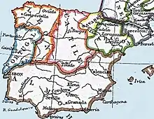 Muslim and Arab forces from Northwest Africa, under the military leadership of Ṭāriq ibn Ziyād, conquered al-Andalus between 711 and 718 C.E. At the time, the region was under the control of the Visigoths but, after the Battle of Guadalete, the area fell to the Umayyad Caliphate. The Caliphate collapsed in the East in 750 CE, but continued on al-Andalus until 1031 when it broke up into 23 small emirates known as the tafia kingdoms. These became the main rivals of the Christian territories on the Peninsula. The Umayyads were then subsequently replaced by the Abbasid Dynasty in the East. Many Christians fled to the Northern parts of the peninsula and established the kingdom of Asturias, which eventually split into the kingdoms of Castile, Galicia, and León.[2] The Asturians conquered the Umayyads at the Battle of Covadonga in 722; this is when many historians determine that the Reconquista began.[3] After this event, the Umayyads faced the loss of Galicia (739), León (754), Barcelona (801), and Salamanca (939). According to the historian Alan Heston, the Caliph of Córdoba, al-Mansur, "undertook more than fifty jihads into Christian areas of northern Spain to pillage and eventually expand Muslim rule to all of present-day Spain."[4] In 997, al-Mansur called for the destruction of the Church of St. James in León. This site served as an important pilgrimage destination for Christians since it claimed to hold the tomb of James, the brother of Jesus. The tomb was left alone, but the church itself was dismembered, with the doors and bells taken to Córdoba to expand its mosque. The year 1000 saw the weakening of Islamic hold on the peninsula since al-Mansur left Córdoba in a weaker condition than he received it and the Umayyad caliphate finally broke apart in 1031.[4]