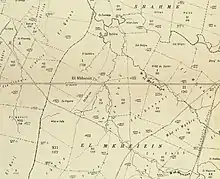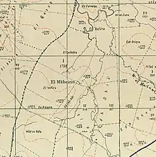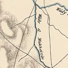 | Etymology: Kh. el Mukheizin, the ruin of the storehouses[1] | |