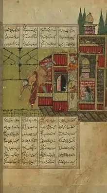 ![]() 11th-century illustration of Nu'man throwing Sinnimar from the roof of the palace Khawarnaq. | |