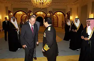 ![]() Secretary of Defense Donald Rumsfeld (left) being greeted by Crown Prince Salman bin Hamad Al Khalifa in the Gudaibiya Palace on 9 October 2004 | |