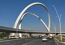 The Al Wahda Arches (also called 5/6 Arch, Qatar Arch, Gateway Arch) is a monumental pair of 20° inclined steel arches, spanning the "5/6 interchange" of the Lusail expressway, Qatar which connects West Bay with Lusail City. It is the tallest monument in the country and has received a 2020 International Design Award[1] and 2018 ENR Global Best Project award.[5] Intended to be viewed while in motion as an "immersive public artwork", the arches are connected to each other by a cable net – a reference to Qatar's pearl diving heritage.[1] The structure itself consists of 54 large steel pieces, weighing over 9,000 tons, while the base of the arches are clad in Limra Limestone from Turkey.[2]