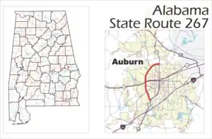 State Route 267 (SR 267) was a state highway in Alabama and a loop route of SR 147, bypassing downtown Auburn to the west. For its entire 5.1-mile (8.2 km) length, SR 267 was known as the Shug Jordan Parkway (named for Auburn University football coach Ralph "Shug" Jordan).