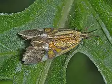 Alabonia staintoniella has a wingspan of 17–21 millimetres (0.67–0.83 in). This little diurnal moth shows yellowish-brown hindwings, with silvery markings, two triangular white spots on the costal and on the inner edge and a blackish fringe. It presents very long labial palps