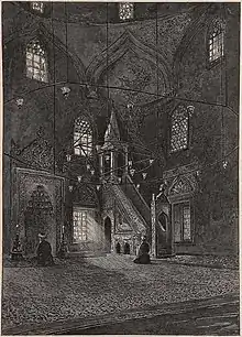 Their floor plan was almost square (11.22 m by 11.30 m). The dome, which had a diameter of 11 m, rose above an octagonal drum. The height to the apex of the dome was 19.85 m. There were 5 windows in each of the three sides of the mosque, and in front of the front there was a vestibule with pointed arched arches supported by four marble columns and three domes. The minaret was 36 m high. Inside mihrab, minbar and muezzin mahfili there was an Islamic stone sculpture, which was considered the most beautiful in the Balkans (Trifunović). The mosque had picture decorations, including a rosette on the north wall with floral decoration and wall painting in the lobby.