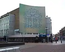 • Three Ships mural mosaic (1963; locally listed; Grade II listed 2019[4]) on the former Hull and East Riding Society Cooperative Store (and later a BHS), in Kingston upon Hull.[16] The 66 ft by 64 ft (20m x 19.5m) glass mosaic mural is on the exterior of the building (with two further murals inside). In 2019 there was an online petition[17] to get this mural Grade II listed by Historic England. Grade II listing was announced in November 2019.[18]