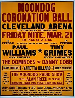 Later that year, Freed promoted dances and concerts featuring the music he was playing on the radio. He was one of the organizers of a five-act show called "The Moondog Coronation Ball" on March 21, 1952, at the Cleveland Arena.[29] This event is now considered to have been the first major rock and roll concert.[4] Crowds attended in numbers far beyond the arena's capacity, and the concert was shut down early due to overcrowding and a near-riot.[29] Freed gained notoriety from the incident. WJW immediately increased the airtime allotted to Freed's program, and his popularity soared.[27]
