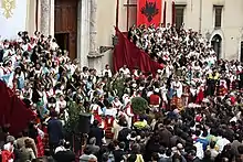 The national ethnonym Albanian and its variants are derived from Albanoi, first mentioned as an Illyrian tribe in the 2nd century CE by Ptolemy with their centre at the city of Albanopolis, located in modern-day central Albania, somewhere in the hinterland of Durrës.[95][81][96][97][98][99] Linguists believe that the alb part in the root word originates from an Indo-European term for a type of mountainous topography, from which other words such as alps are derived.[100] Through the root word alban and its rhotacized equivalents arban, albar, and arbar, the term in Albanian became rendered as Arbëneshë/Arbëreshë for the people and Arbënia/Arbëria for the country.[80][81] The Albanian language was referred to as Arbnisht and Arbërisht.[96] While the exonym Albania for the general region inhabited by the Albanians does have connotations to Classical Antiquity, the Albanian language employs a different ethnonym, with modern Albanians referring to themselves as Shqip(ë)tarë and to their country as Shqipëria.[81] Two etymologies have been proposed for this ethnonym: one, derived from the etymology from the Albanian word for eagle (shqipe, var., shqiponjë).[83] In Albanian folk etymology, this word denotes a bird totem, dating from the times of Skanderbeg as displayed on the Albanian flag.[83][101] The other is within scholarship that connects it to the verb 'to speak' (me shqiptue) from the Latin "excipere".[83] In this instance the Albanian endonym like Slav and others would originally have been a term connoting "those who speak [intelligibly, the same language]".[83] The words Shqipëri and Shqiptar are attested from 14th century onward,[102] but it was only at the end of 17th and beginning of the early 18th centuries that the placename Shqipëria and the ethnic demonym Shqiptarë gradually replaced Arbëria and Arbëreshë amongst Albanian speakers.[81][102] That era brought about religious and other sociopolitical changes.[81] As such a new and generalised response by Albanians based on ethnic and linguistic consciousness to this new and different Ottoman world emerging around them was a change in ethnonym.[81]