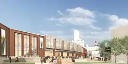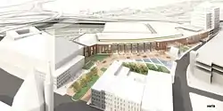 The proposed design of the Albany Convention Center called for a brick and glass structure with an exhibition hall, two ballrooms and other various meeting spaces totaling about 300,000 square feet (28,000 m2).[15] In early 2008, it was announced that the site would include a 400-room Sheraton Hotel, to be run by Starwood Hotels and Resorts Worldwide Inc., of White Plains; a 300,000-square-foot (28,000 m2) convention center, to be operated by SMG Management (the company that operates the Times Union Center), and an 1,100-car parking garage. A bridge would also connect the convention center to the Times Union Center.[9] The back of the center would face the South Mall Arterial, and there would be loading docks on that side of the structure. A plaza near the center of the complex would face Broadway. The design allowed for future expansion of the convention space.[15]